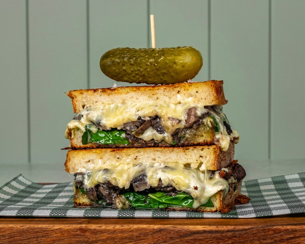 House-made roasted garlic mushrooms, spinach, basil pesto, Swiss cheese on sourdough