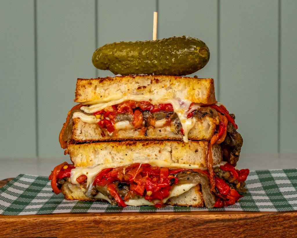 House-made roasted pepper, roasted eggplant, tomato relish, Swiss cheese on sourdough